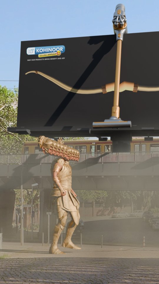 A massive pair of Dyson headphones appears in the middle of busy city traffic, perched atop a yellow auto-rickshaw as it navigates through an autumn-lined boulevard. The oversized headphones tower over the vehicle beneath them, showcasing the iconic blue and orange design against historic architecture. This bold Dyson FOOH ad brings premium audio technology into the chaos of everyday commutes, proving that exceptional sound quality can cut through any noise. It transforms an ordinary street scene into a powerful statement about immersive listening experiences.
