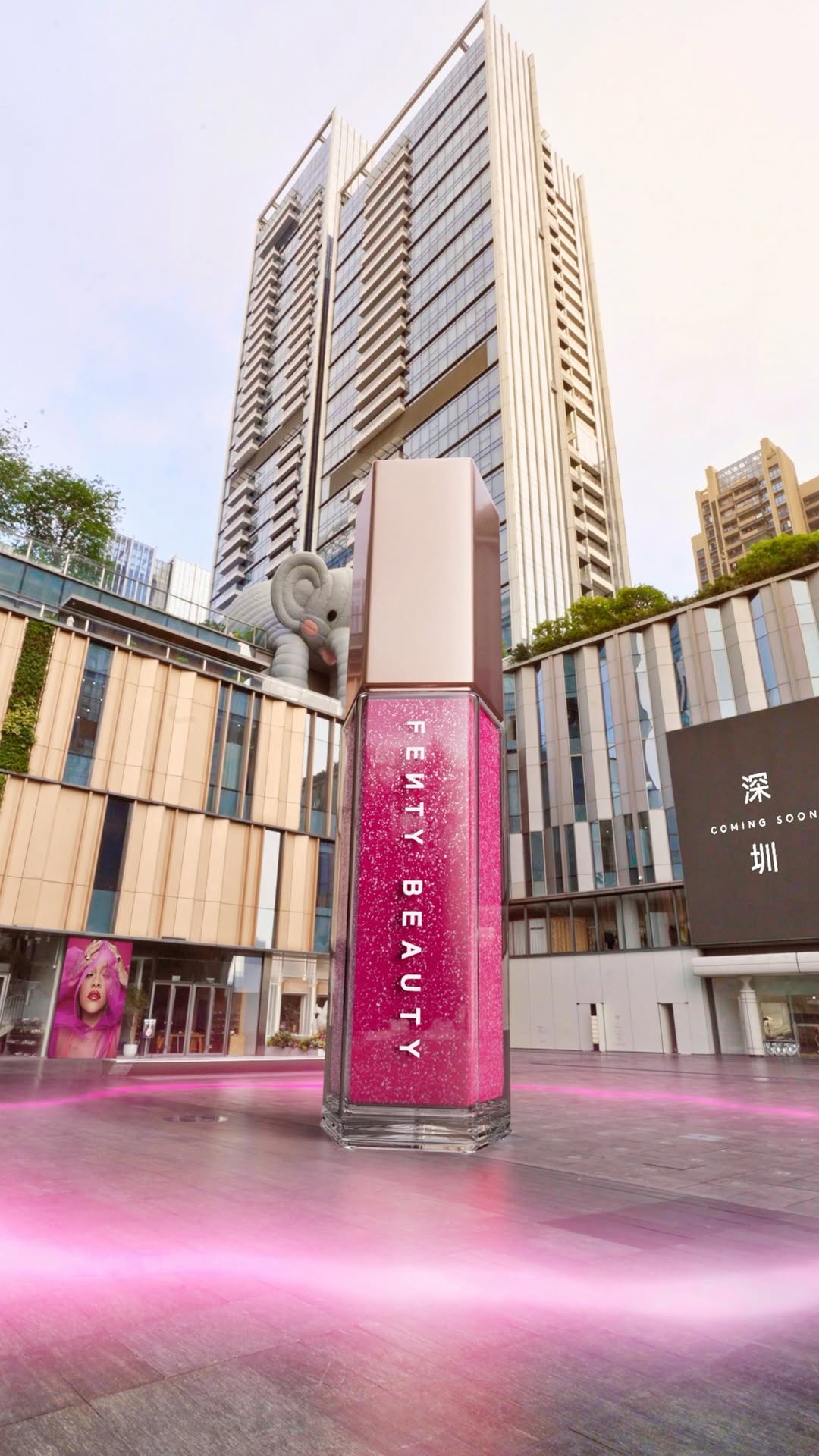 A giant Fenty Skin product floats on a pastel pink inflatable in the crystal-clear turquoise waters of a Mediterranean cove, framed by dramatic cliffs and luxury villas. Boats drift lazily around the oversized beauty bottle while a man works from a sun-drenched balcony overlooking the surreal scene. The idyllic coastal setting captures the essence of summer relaxation and self-care. This Fenty Skin FOOH advertisement merges vacation dreams with skincare essentials, celebrating effortless beauty in paradise.