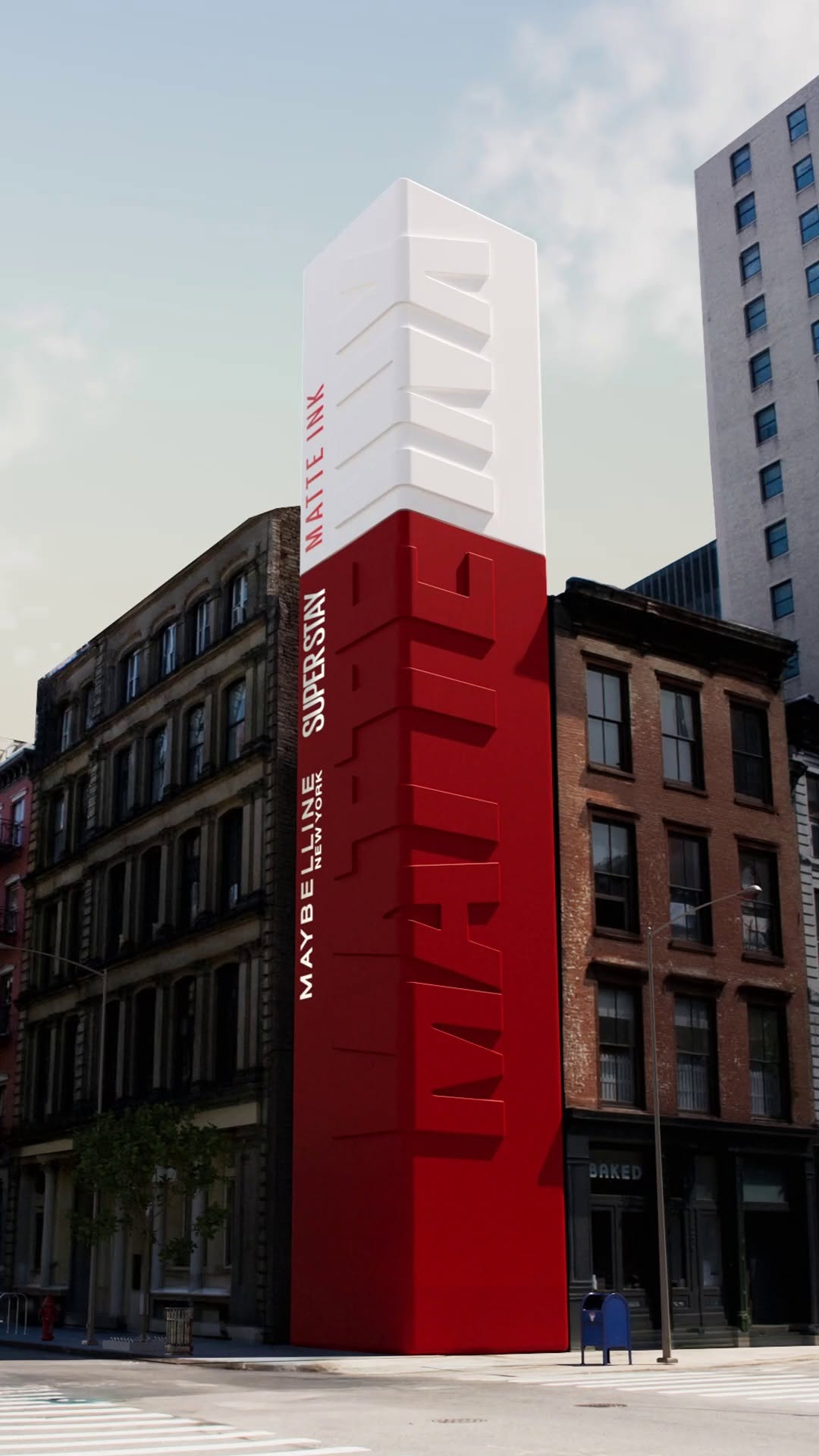 A towering Max Factor Long Lash Era mascara tube rises alongside a classic Amsterdam building, its oversized brush painting dramatic lashes above a window to demonstrate the lengthening effect. The pink mascara with gold lettering contrasts against traditional Dutch architecture, turning the street into a live beauty demonstration. This Max Factor FOOH ad showcases the 2000 Calorie formula in action across Amsterdam's iconic urban landscape.