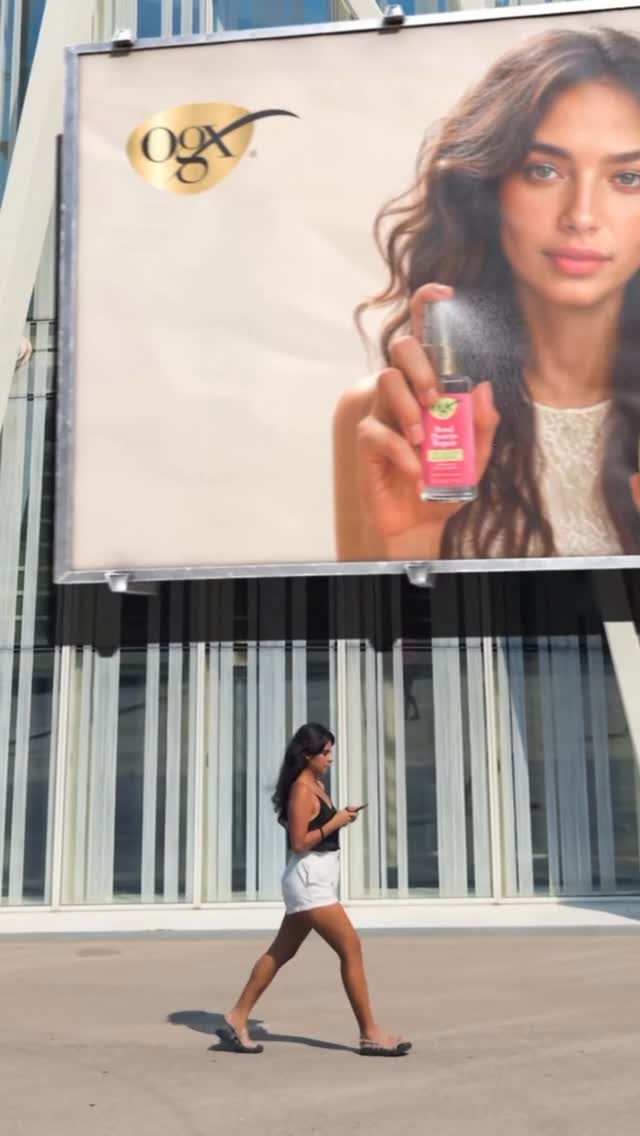 Giant coconuts transform into natural beauty stations on a pristine beach as OGX's Nourishing Coconut Oil bottles nestle perfectly inside the cracked shells. Fresh coconuts scattered across the sand become luxurious hair treatment pods while beachgoers enjoy the tropical paradise. This creative FOOH brings the "cracked the case to frizzy hair" concept to life, turning the beach into a natural salon where coconut oil meets hair care in the most Instagram-perfect tropical setting.