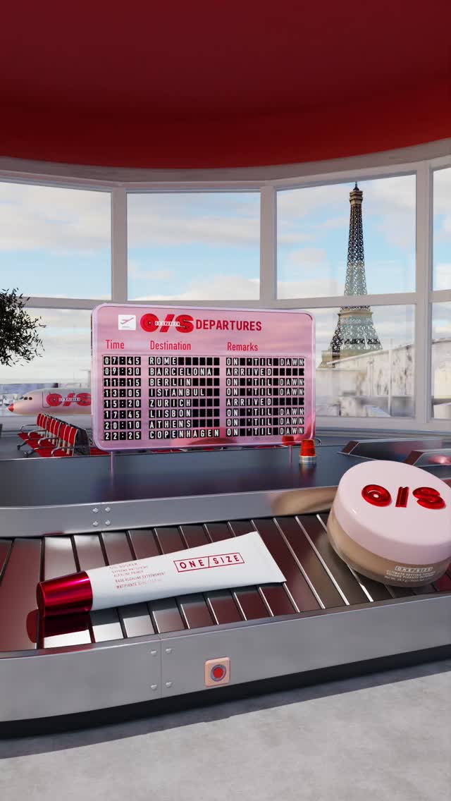 Giant red ONE/SIZE letters crown the Arc de Triomphe while massive beauty products surround the iconic monument as Paris prepares for SEPHORiA. Pink beauty tubes tower beside the arch and a huge compact mirror rests on the Champs-Élysées as the Eiffel Tower displays matching red branding in the distance. This spectacular FOOH ad transforms Paris into ONE/SIZE's beauty playground, turning the entire city into a massive advertisement for the brand's appearance at SEPHORiA in October.
