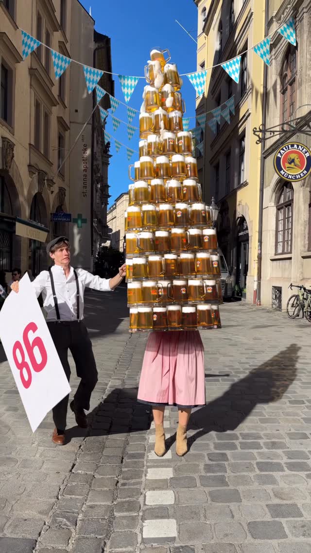 A colossal Paulaner beer stein perches atop a traditional Bavarian building, its golden brew filling the iconic dimpled glass mug complete with classic blue and white striped maypole and authentic branding. The beer dramatically fills and overflows with perfect foam cascading down the sides, capturing the essence of Munich's beloved brewing tradition. This Paulaner FOOH ad celebrates Oktoberfest spirit and Bavarian beer culture with a larger-than-life toast to the classic "just one more" moment.