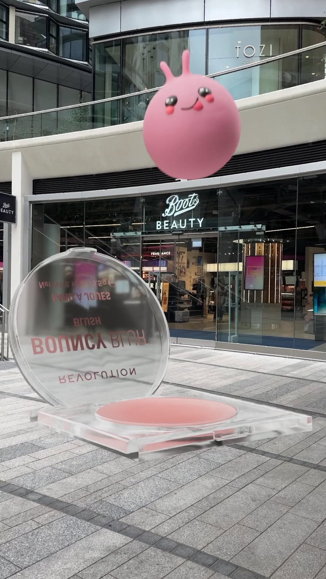 Giant Superdewy Blush Burst bottles float through London's financial district as one dramatically explodes, showering the urban canyon with vibrant coral liquid and floating pigment spheres. The massive makeup products transform the sterile business environment into a saturated beauty playground, with glowing reflections and dynamic splashes coating the modern architecture. This stunning FOOH campaign captures the product's "fluidity, color, and freshness," turning city streets into an immersive demonstration of Revolution's juicy textures and moisture-rich formula.