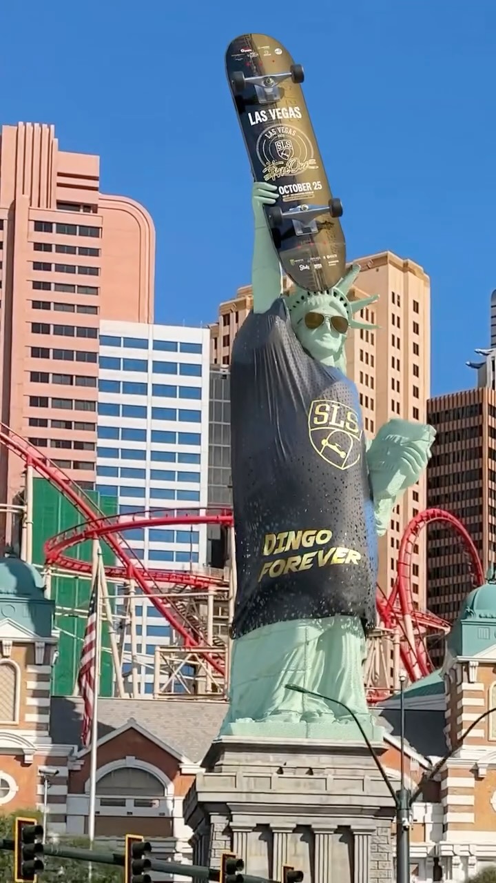 A massive skateboard is transported through Las Vegas streets on a semi-truck trailer, dwarfing the iconic casino buildings in the background. The oversized deck rolls past the Treasure Island hotel while displaying sponsor logos from Monster Energy, Samsung Galaxy, and other major brands. This bold SLS FOOH ad announces the October 25th Street League Skateboarding event, turning Sin City's famous Strip into the ultimate skateboard highway where extreme sports meet Vegas spectacle.