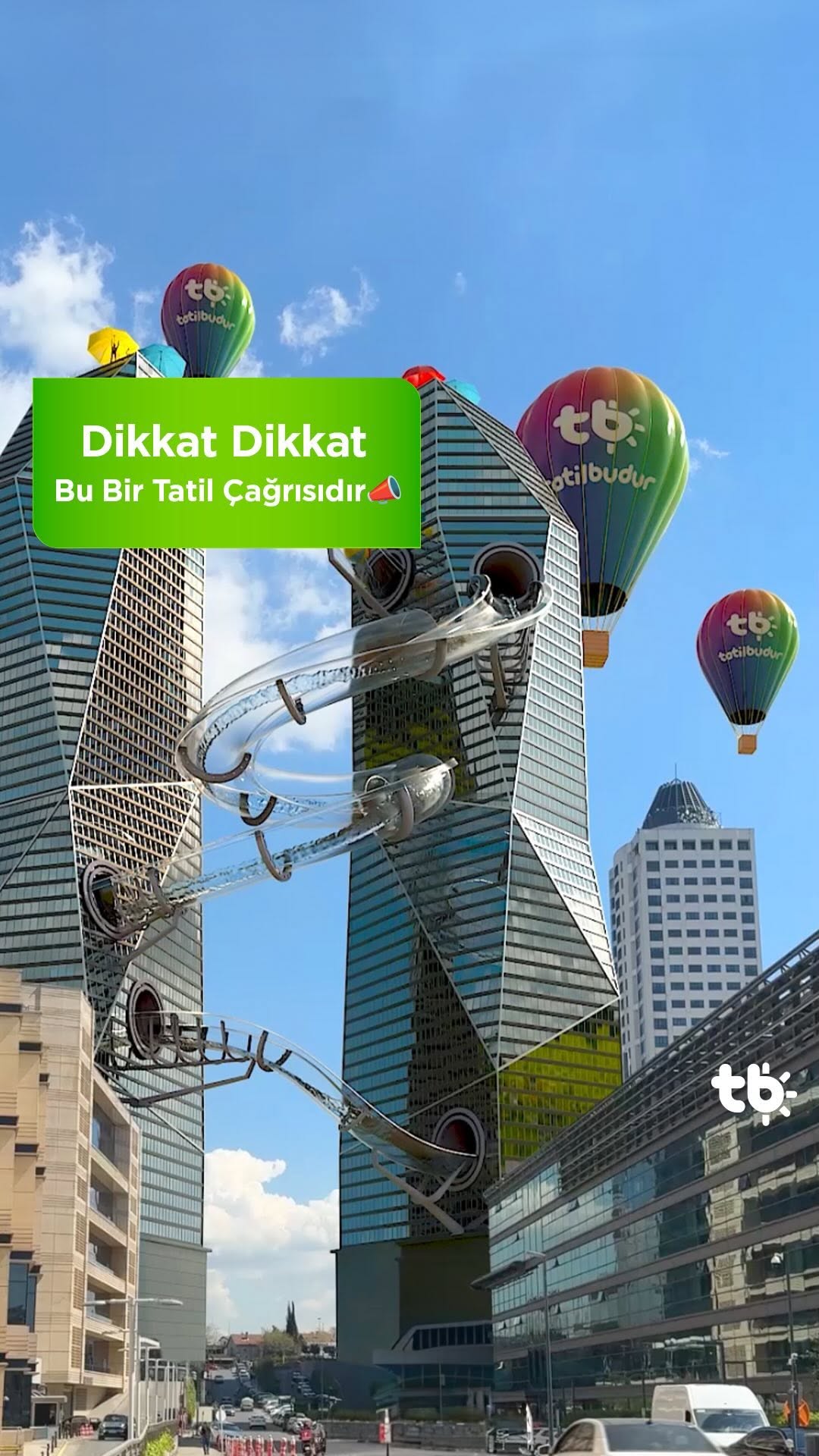 A massive colorful suitcase covered in playful travel stickers floats through Turkish streets, past yellow taxis at traffic circles, through airport terminals, and onto the tarmac beside waiting aircraft. The oversized luggage adorned with the TatilBudur logo travels from city to sky, bringing vacation excitement to life. This TatilBudur FOOH ad captures the thrill of travel, reminding viewers that a holiday isn't just a small plan but a big adventure that begins the moment your suitcase is packed.